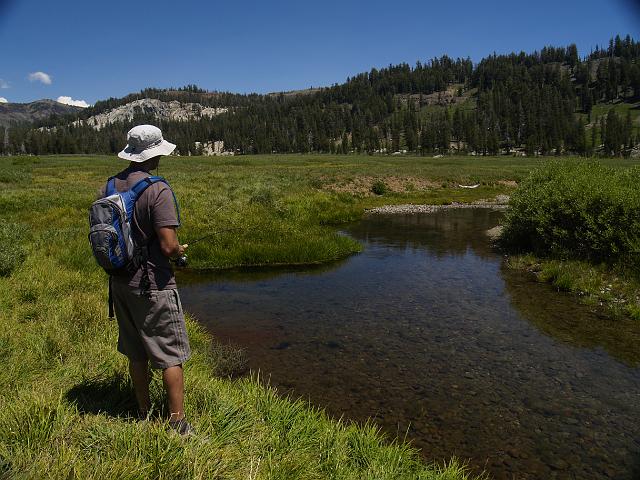 | Steve shoots for the pool over the grassy ledge. The fish are spooky here, so you have to sneak up on them. | |